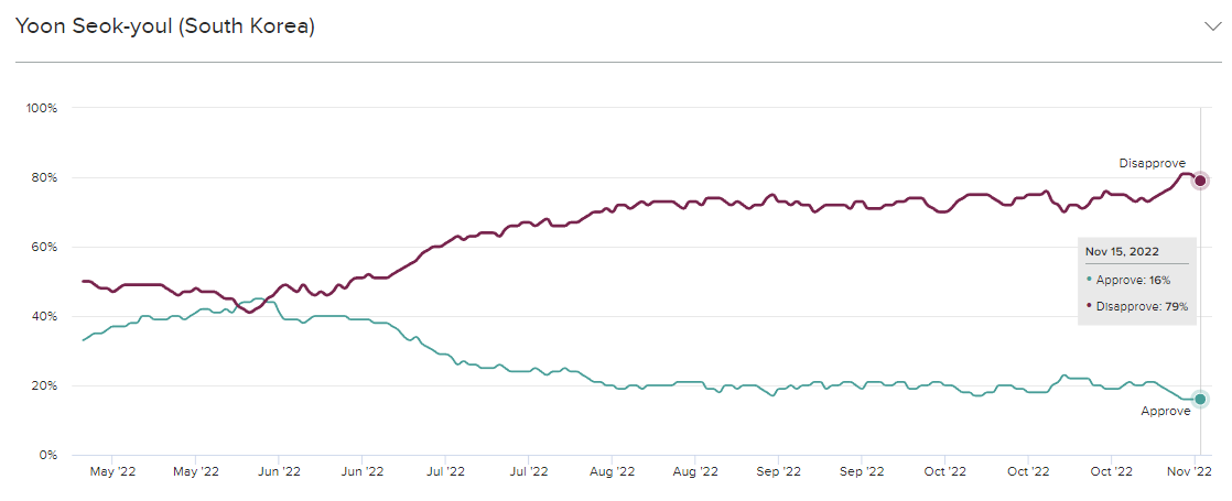 이는 10월 20일, 27일 2주간 퇴임한 영국의 트러스 총리가 최하위를 기록한 것을 제외하면 13주 동안 최하위 자리를 차지하고 있는 것입니다.